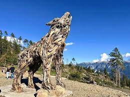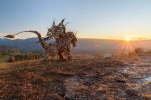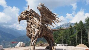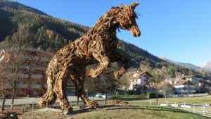 Firmato dall’artista Marco Martalar, in tutti i suoi 7 metri di altezza si impenna sulle zampe questa monumentale opera realizzata con le radici e i legni degli alberi devastati dalla tempesta di Vaia. Prosegue l’opera di recupero dopo la devastazione che si è abbattuta il 29 ottobre 2018 sulle foreste di Veneto, Trentino Alto Adige e Friuli Venezia Giulia. Un recupero artistico che per Martalar è anche un segno di speranza e rinascita, come spesso ha dichiarato.