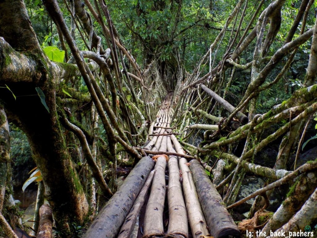 Da Tyrna, una ripidissima scala di SOLO 3800 gradini che fronteggia questa parete rocciosa ci porta in uno degli scenari più spettacolari che abbiamo mai visto durante questo viaggio in Asia. Questa volta chiudete voi gli occhi e provate ad immaginarlo seguendo le nostre parole: immaginate di scendere da queste scale e trovarvi in una foresta con vegetazione tropicale fittissima, piena di alberi stranissimi, liane, insetti di ogni tipo; pensate di dover attraversare dei torrenti impetuosi camminando su dei ponti fatti di radici delle piante intrecciate: si, avete capito benissimo! Le tribù locali, tanti anni fa, hanno “insegnato” alle radici delle piante a crescere in maniera che, intersecandosi fra di loro, formassero la trama di un ponte sul quale poi gli stessi avrebbero potuto attraversare i fiumi in piena. Immaginate poi, superato lo stupore di questi primi ponti, di arrivare nel minuscolo villaggio di Nongriat, dove si trova un altro ponte fatto di radici.. a due piani! Due alberi immensi ai due lati opposti del torrente, in un lungo lavoro di crescita durato centinaia di anni, hanno intersecato le radici a due diverse altezze, in modo da creare due ponti, uno basso e uno più alto da utilizzare durante le stagioni dei monsoni, quando il fiume è in piena e il primo ponte viene sommerso: insomma Tower Bridge di Londra fatte da parte!