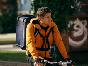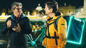 Detto fatto, il nostro sfortunato protagonista si ritrova a doversi reinventare. Gli arriva così, con una modalità pari a quella de il gatto e la volpe di Pinocchio, la proposta per un lavoro dai contorni molto fumosi. In poche parole si ritrova abbindolato da una multinazionale come rider. Un po’ come il tenore di molti media che in tempo di Covid descriveva la scelta di fare il rider di professionisti musicisti o professori o persone che si erano ritrovate senza poter lavorare per le restrizioni e i lockdown, come un’esperienza entusiasmante. I toni erano elogiativi del contatto con la natura, il movimento fisico, la nuova prospettiva. Eppure non ci voleva molto per capire il gioco della propaganda becera che elogiava un lavoro di sfruttamento e fatica.