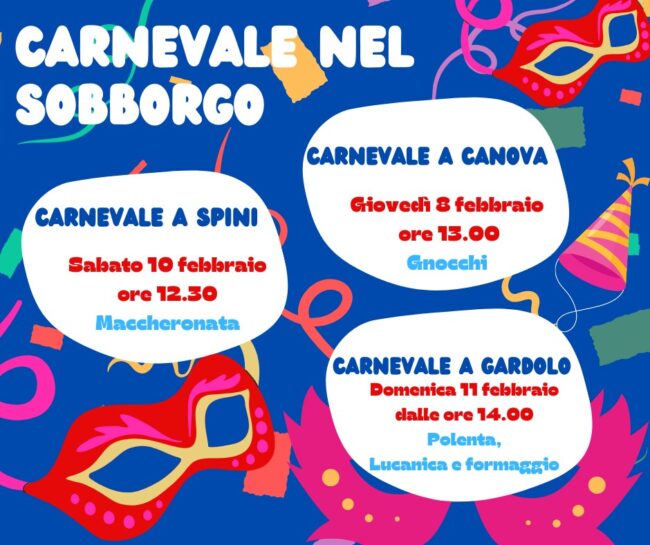 Carnevale a VILLA LAGARINA Maccheroni al ragù, panini, patatine fritte, dalle 14.30 sfilata delle mascherine e intrattenimento per bambini.