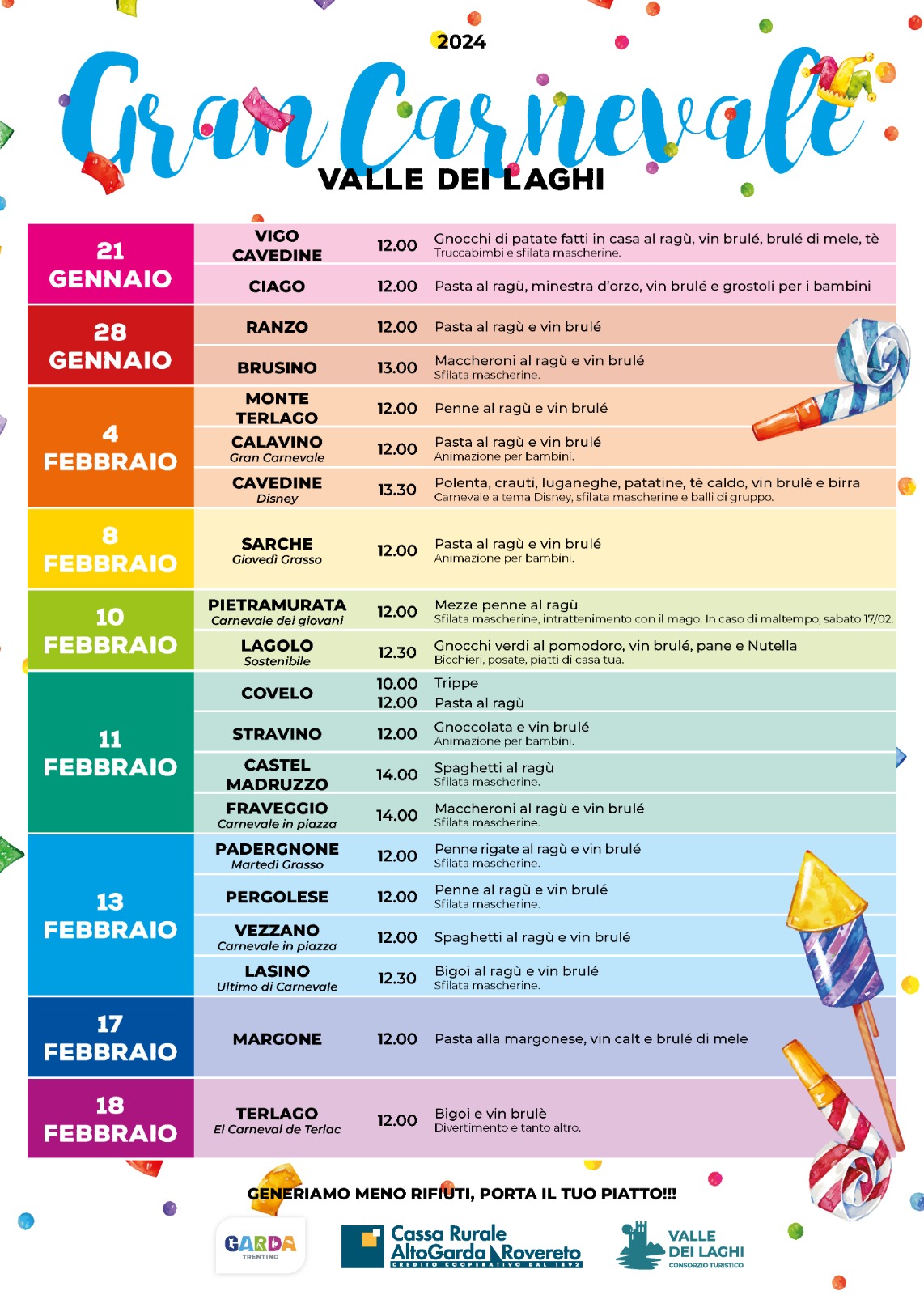 Carnevale a VILLA LAGARINA Maccheroni al ragù, panini, patatine fritte, dalle 14.30 sfilata delle mascherine e intrattenimento per bambini.